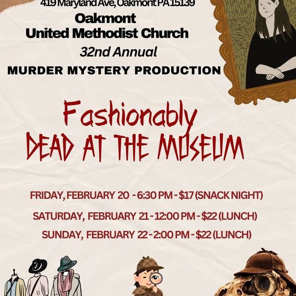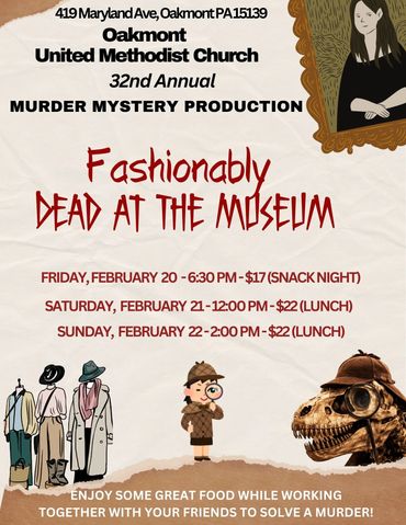 Fashion and murder collide in this year’s mystery dinner at the Oakmont United Methodist Church. A history museum is attempting to find modern-day relevance with a fundraising Fashion Show. Hijinks, Humor, and Homicide ensue.